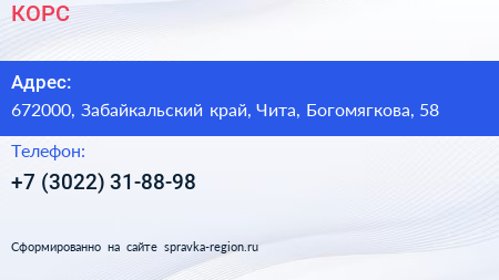 КОРС по адресу 672000, Забайкальский край, Чита, Богомягкова, 58 в дальнейшем Организация, размещена в следующих категориях: