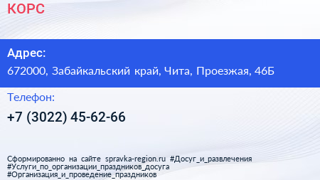 КОРС по адресу 672000, Забайкальский край, Чита, Проезжая, 46Б в дальнейшем Организация, размещена в следующих категориях: