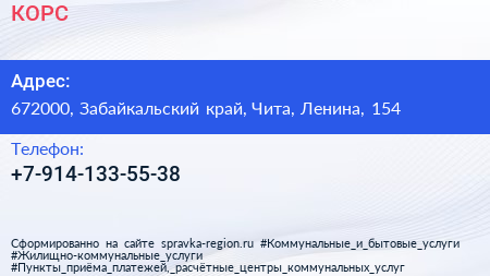 КОРС по адресу 672000, Забайкальский край, Чита, Ленина, 154 в дальнейшем Организация, размещена в следующих категориях: