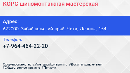 КОРС, шиномонтажная мастерская по адресу 672000, Забайкальский край, Чита, Ленина, 154 в дальнейшем Организация, размещена в следующих категориях: