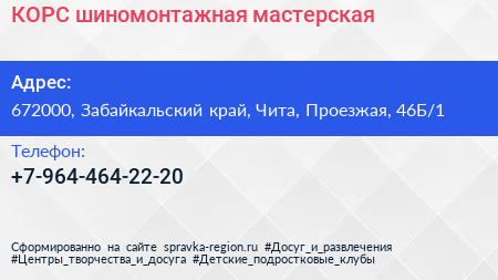 КОРС, шиномонтажная мастерская по адресу 672000, Забайкальский край, Чита, Проезжая, 46Б/1 в дальнейшем Организация, размещена в следующих категориях: