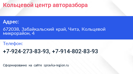 Кольцевой, центр авторазбора по адресу 672038, Забайкальский край, Чита, Кольцевой микрорайон, 4 в дальнейшем Организация, размещена в следующих категориях: