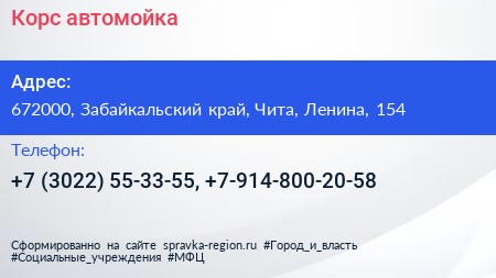 Корс, автомойка по адресу 672000, Забайкальский край, Чита, Ленина, 154 в дальнейшем Организация, размещена в следующих категориях: