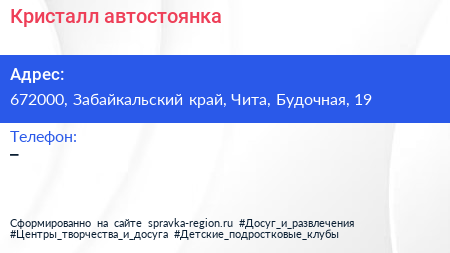 Кристалл, автостоянка по адресу 672000, Забайкальский край, Чита, Будочная, 19 в дальнейшем Организация, размещена в следующих категориях: