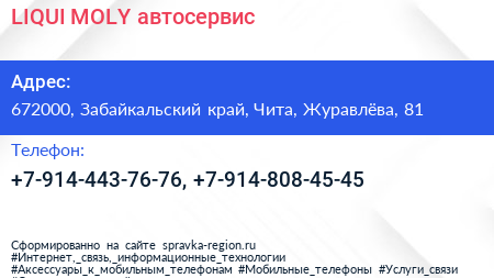 LIQUI MOLY, автосервис по адресу 672000, Забайкальский край, Чита, Журавлёва, 81 в дальнейшем Организация, размещена в следующих категориях: