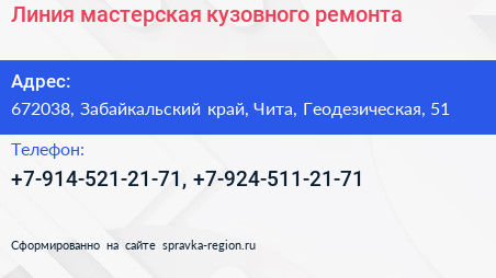 Линия, мастерская кузовного ремонта по адресу 672038, Забайкальский край, Чита, Геодезическая, 51 в дальнейшем Организация, размещена в следующих категориях: