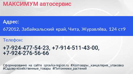 МАКСИМУМ, автосервис по адресу 672012, Забайкальский край, Чита, Журавлёва, 124 ст9 в дальнейшем Организация, размещена в следующих категориях: