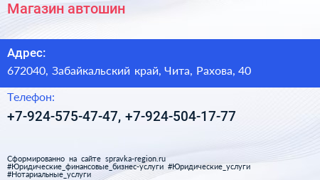 Магазин автошин по адресу 672040, Забайкальский край, Чита, Рахова, 40 в дальнейшем Организация, размещена в следующих категориях: