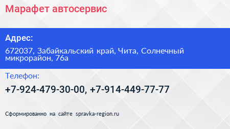 Марафет, автосервис по адресу 672037, Забайкальский край, Чита, Солнечный микрорайон, 76а в дальнейшем Организация, размещена в следующих категориях: