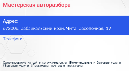 Мастерская авторазбора по адресу 672006, Забайкальский край, Чита, Засопочная, 19 в дальнейшем Организация, размещена в следующих категориях: