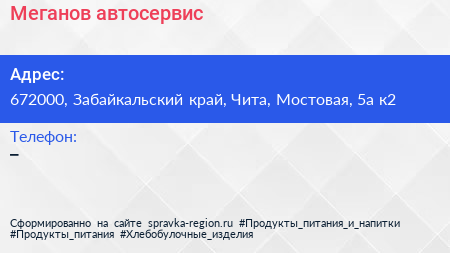 Меганов, автосервис по адресу 672000, Забайкальский край, Чита, Мостовая, 5а к2 в дальнейшем Организация, размещена в следующих категориях: