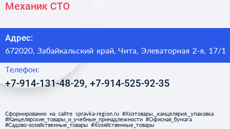 Механик, СТО по адресу 672020, Забайкальский край, Чита, Элеваторная 2-я, 17/1 в дальнейшем Организация, размещена в следующих категориях: