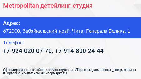 Metropolitan, детейлинг-студия по адресу 672000, Забайкальский край, Чита, Генерала Белика, 1 в дальнейшем Организация, размещена в следующих категориях: