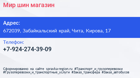 Мир шин, магазин по адресу 672039, Забайкальский край, Чита, Кирова, 17 в дальнейшем Организация, размещена в следующих категориях: