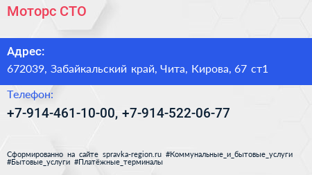Моторс, СТО по адресу 672039, Забайкальский край, Чита, Кирова, 67 ст1 в дальнейшем Организация, размещена в следующих категориях: