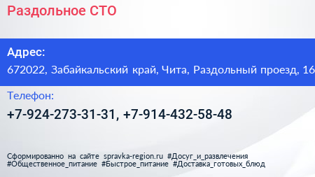 Раздольное, СТО по адресу 672022, Забайкальский край, Чита, Раздольный проезд, 16 в дальнейшем Организация, размещена в следующих категориях: