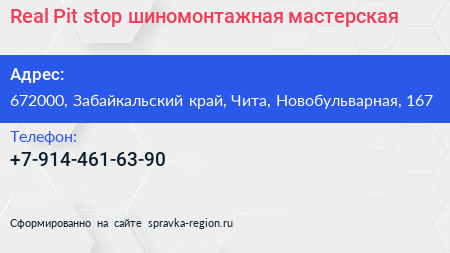 Real Pit-stop, шиномонтажная мастерская по адресу 672000, Забайкальский край, Чита, Новобульварная, 167 в дальнейшем Организация, размещена в следующих категориях: