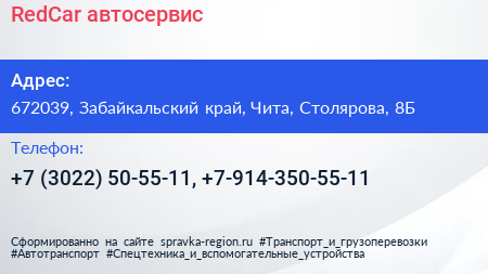RedCar, автосервис по адресу 672039, Забайкальский край, Чита, Столярова, 8Б в дальнейшем Организация, размещена в следующих категориях: