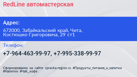 RedLine, автомастерская по адресу 672000, Забайкальский край, Чита, Костюшко-Григоровича, 29 ст1 в дальнейшем Организация, размещена в следующих категориях: