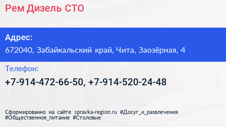 Рем-Дизель, СТО по адресу 672040, Забайкальский край, Чита, Заозёрная, 4 в дальнейшем Организация, размещена в следующих категориях: