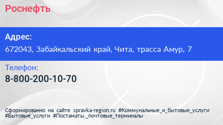 Роснефть по адресу 672043, Забайкальский край, Чита, трасса Амур, 7 в дальнейшем Организация, размещена в следующих категориях: