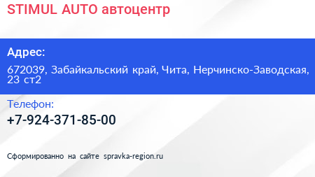 STIMUL AUTO, автоцентр по адресу 672039, Забайкальский край, Чита, Нерчинско-Заводская, 23 ст2 в дальнейшем Организация, размещена в следующих категориях: