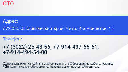 СТО по адресу 672030, Забайкальский край, Чита, Космонавтов, 15 в дальнейшем Организация, размещена в следующих категориях: