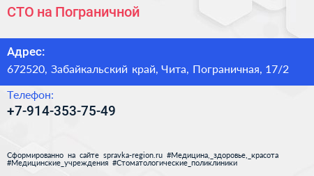 СТО на Пограничной по адресу 672520, Забайкальский край, Чита, Пограничная, 17/2 в дальнейшем Организация, размещена в следующих категориях: