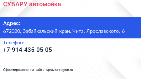 СУБАРУ, автомойка по адресу 672020, Забайкальский край, Чита, Ярославского, 6 в дальнейшем Организация, размещена в следующих категориях: