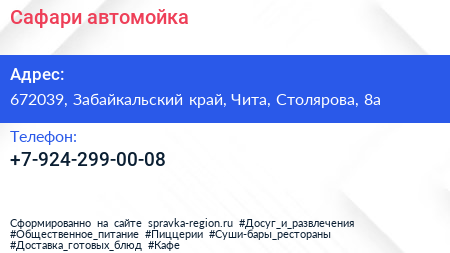 Сафари, автомойка по адресу 672039, Забайкальский край, Чита, Столярова, 8а в дальнейшем Организация, размещена в следующих категориях:
