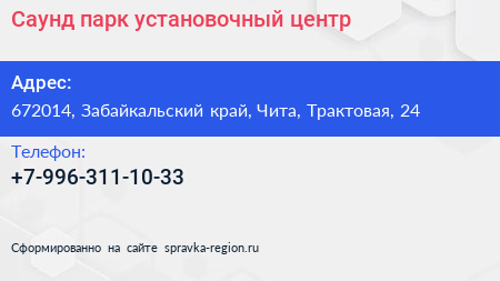 Саунд парк, установочный центр по адресу 672014, Забайкальский край, Чита, Трактовая, 24 в дальнейшем Организация, размещена в следующих категориях: