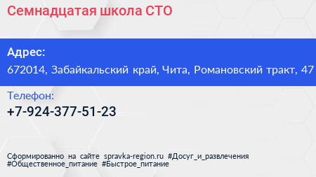 Семнадцатая школа, СТО по адресу 672014, Забайкальский край, Чита, Романовский тракт, 47 в дальнейшем Организация, размещена в следующих категориях: