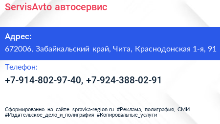 ServisAvto, автосервис по адресу 672006, Забайкальский край, Чита, Краснодонская 1-я, 91 в дальнейшем Организация, размещена в следующих категориях: