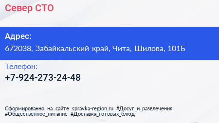 Север, СТО по адресу 672038, Забайкальский край, Чита, Шилова, 101Б в дальнейшем Организация, размещена в следующих категориях: