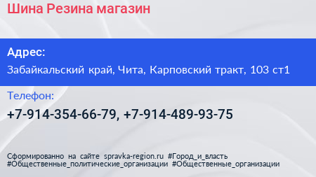 Шина Резина, магазин по адресу Забайкальский край, Чита, Карповский тракт, 103 ст1 в дальнейшем Организация, размещена в следующих категориях: