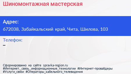 Шиномонтажная мастерская по адресу 672038, Забайкальский край, Чита, Шилова, 103 в дальнейшем Организация, размещена в следующих категориях: