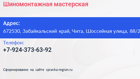 Шиномонтажная мастерская по адресу 672530, Забайкальский край, Чита, Шоссейная улица, 88/2 в дальнейшем Организация, размещена в следующих категориях: