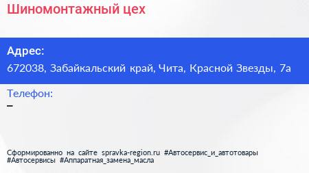 Шиномонтажный цех по адресу 672038, Забайкальский край, Чита, Красной Звезды, 7а в дальнейшем Организация, размещена в следующих категориях: