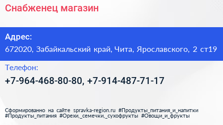Снабженец, магазин по адресу 672020, Забайкальский край, Чита, Ярославского, 2 ст19 в дальнейшем Организация, размещена в следующих категориях: