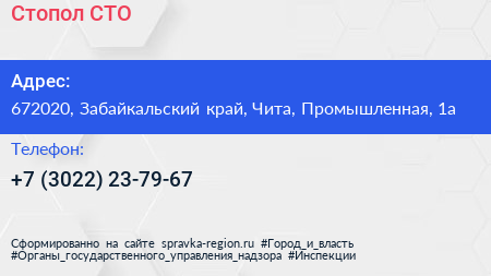 Стопол, СТО по адресу 672020, Забайкальский край, Чита, Промышленная, 1а в дальнейшем Организация, размещена в следующих категориях: