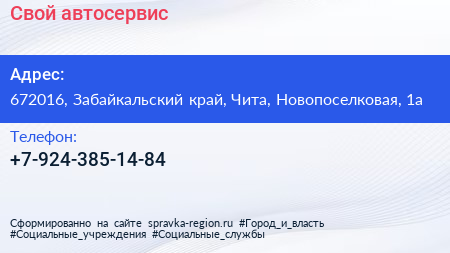 Свой, автосервис по адресу 672016, Забайкальский край, Чита, Новопоселковая, 1а в дальнейшем Организация, размещена в следующих категориях: