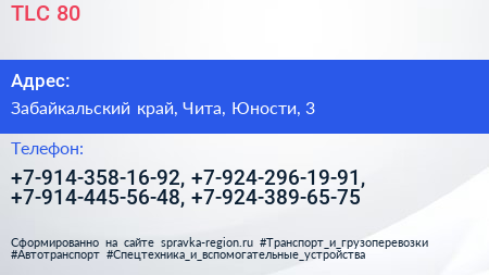 TLC-80 по адресу Забайкальский край, Чита, Юности, 3 в дальнейшем Организация, размещена в следующих категориях: