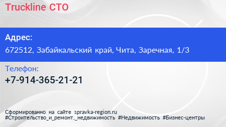 Truckline, СТО по адресу 672512, Забайкальский край, Чита, Заречная, 1/3 в дальнейшем Организация, размещена в следующих категориях: