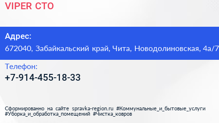VIPER, СТО по адресу 672040, Забайкальский край, Чита, Новодолиновская, 4а/7 в дальнейшем Организация, размещена в следующих категориях: