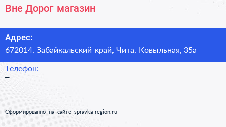 Вне Дорог, магазин по адресу 672014, Забайкальский край, Чита, Ковыльная, 35а в дальнейшем Организация, размещена в следующих категориях: