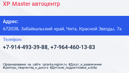 XP Master, автоцентр по адресу 672038, Забайкальский край, Чита, Красной Звезды, 7а в дальнейшем Организация, размещена в следующих категориях: