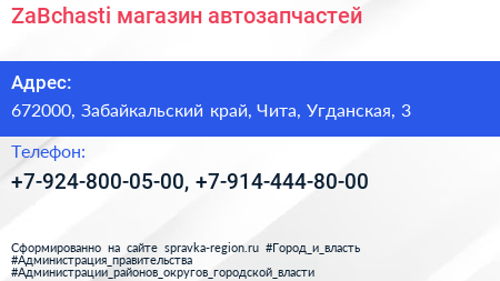 ZaBchasti, магазин автозапчастей по адресу 672000, Забайкальский край, Чита, Угданская, 3 в дальнейшем Организация, размещена в следующих категориях: