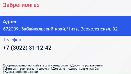Забрегионгаз по адресу 672039, Забайкальский край, Чита, Верхоленская, 32 в дальнейшем Организация, размещена в следующих категориях: