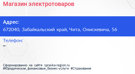 Магазин электротоваров по адресу 672040, Забайкальский край, Чита, Онискевича, 56 в дальнейшем Организация, размещена в следующих категориях: