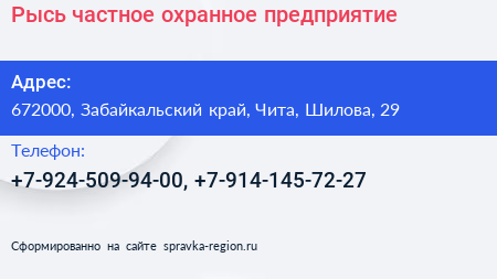 Рысь, частное охранное предприятие по адресу 672000, Забайкальский край, Чита, Шилова, 29 в дальнейшем Организация, размещена в следующих категориях: